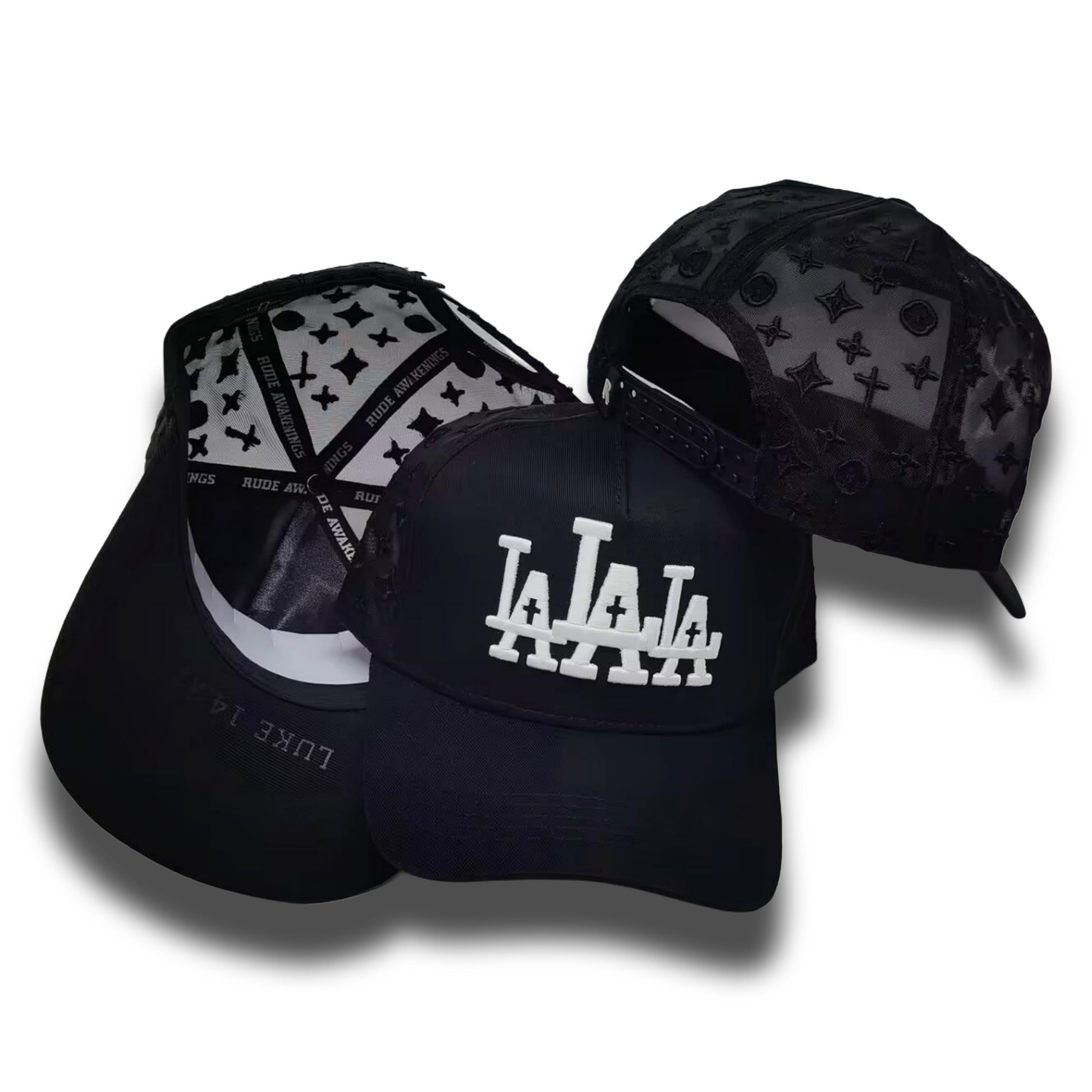 Características: Es una gorra de visera curva con forro interior y bordados laterales. Es ajustable con un broche. El bordado frontal dice "LALALA" y en el interior puede incluir referencias bíblicas como "LUKE 14" o "Mateo 27:29".